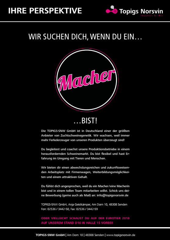 Das Unternehmen TOPIGS-SNW GmbH, ein der größten Anbieter von Zuchtschweinegenetik ion Deutschland, sucht Mitarbeiter, die Erfahrung im Umgang mit Tieren und Menschen haben für die Betreuung seiner Produktionsbetriebe.Geboten wir ein abwechslungsreicher und zukunftsweisender Arbeitsplatz mit Firmenwagen, Weiterbildungsmöglichkeiten und einem attraktiven Gehalt. Bewerbungen werden an info@topigsnorsvin.de erbeten oder Interessenten nutzen die EuroTier, um auf dem Messestand des Unternehmens in Halle alle 15 (Stand-Nr. D16) erste Gespräche zu führen.